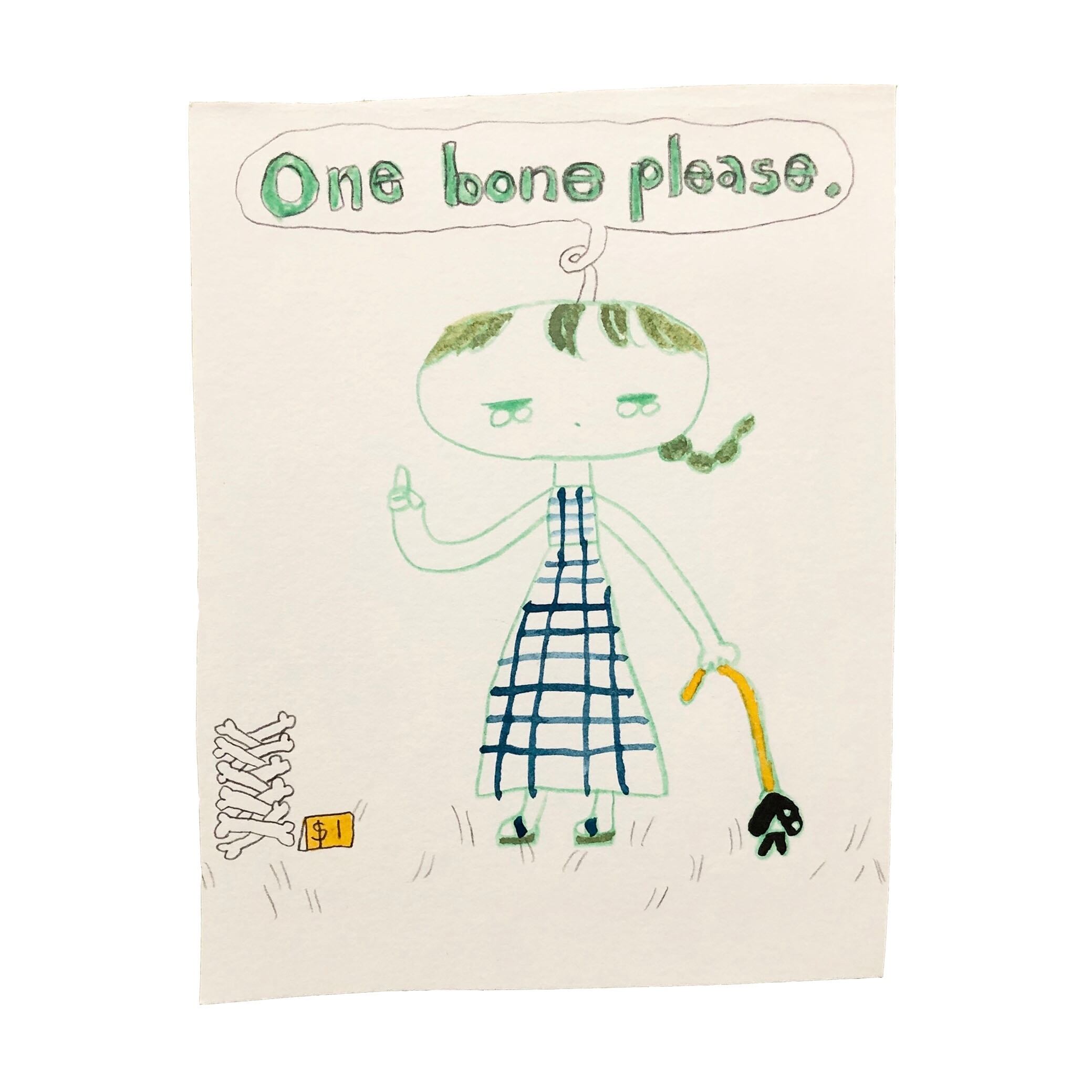 田舎に住む姉妹の妹が犬の散歩中、犬用の骨を見つけて買う様子。犬は興味が無いみたい。